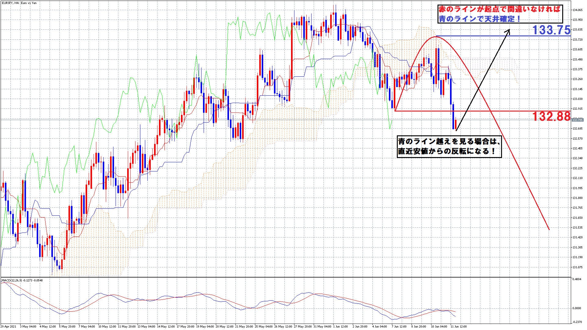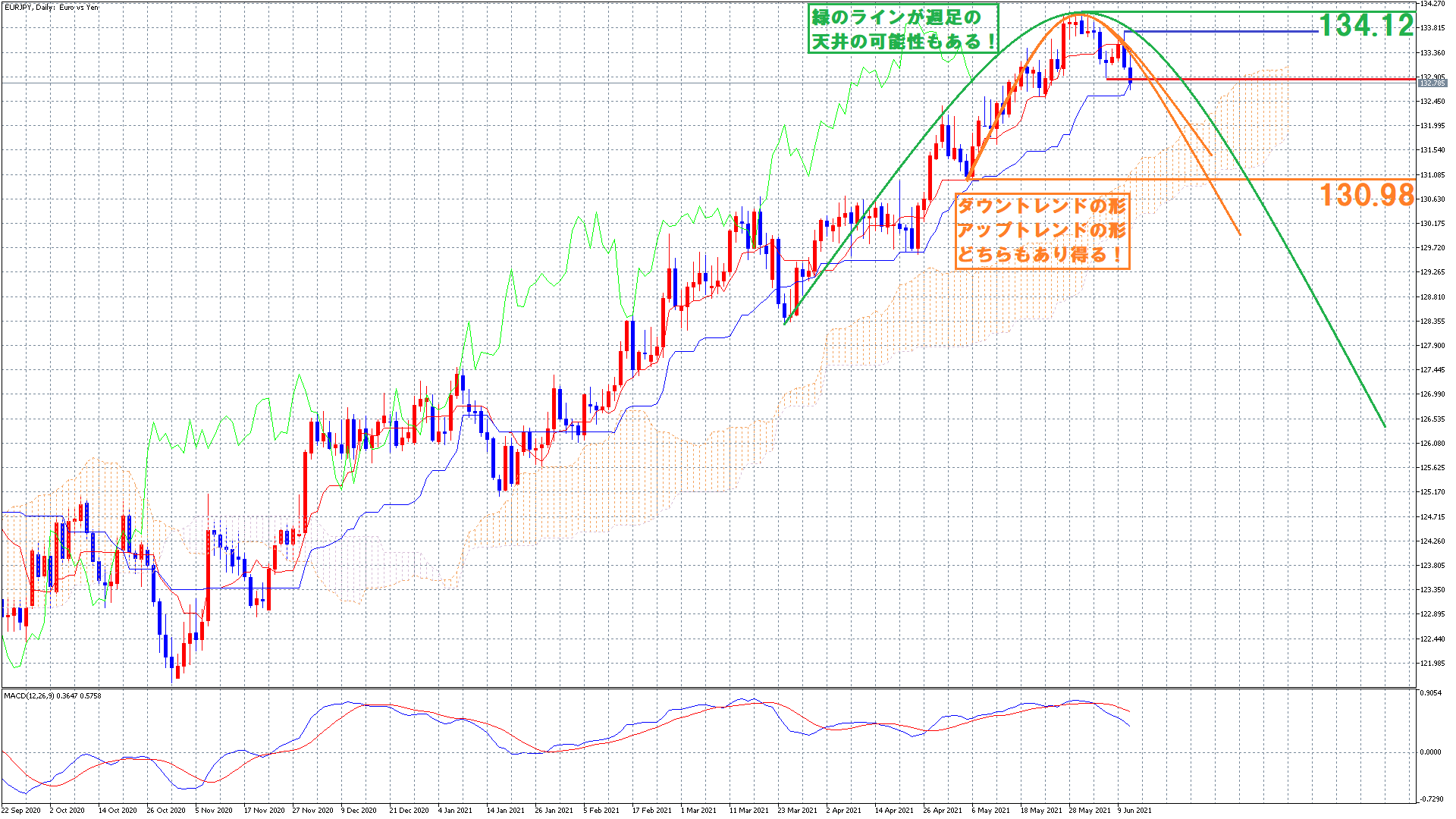 つまり、ユーロ円でいえば緑のラインで週足が下落反転している可能性があるという事です。