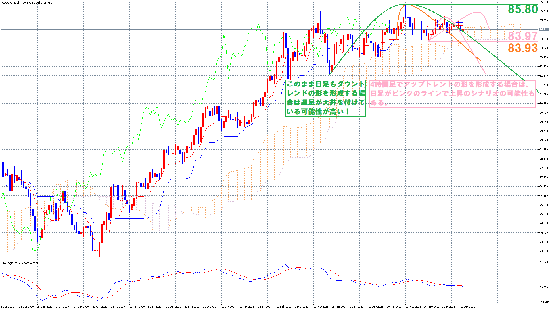 なので、豪ドル円は緑のラインで週足が天井を付けている可能性があるという事です。
