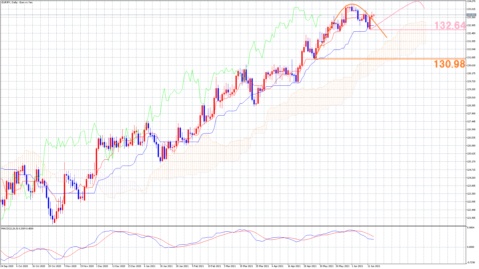 またユーロ円だけではなく、NZドル円や加ドル円も同じ状況なので、NZドル円や加ドル円などでも直近高値越えを見るようであれば、ユーロ円もピンクのラインが起点のシナリオで見ていきたいと思います。