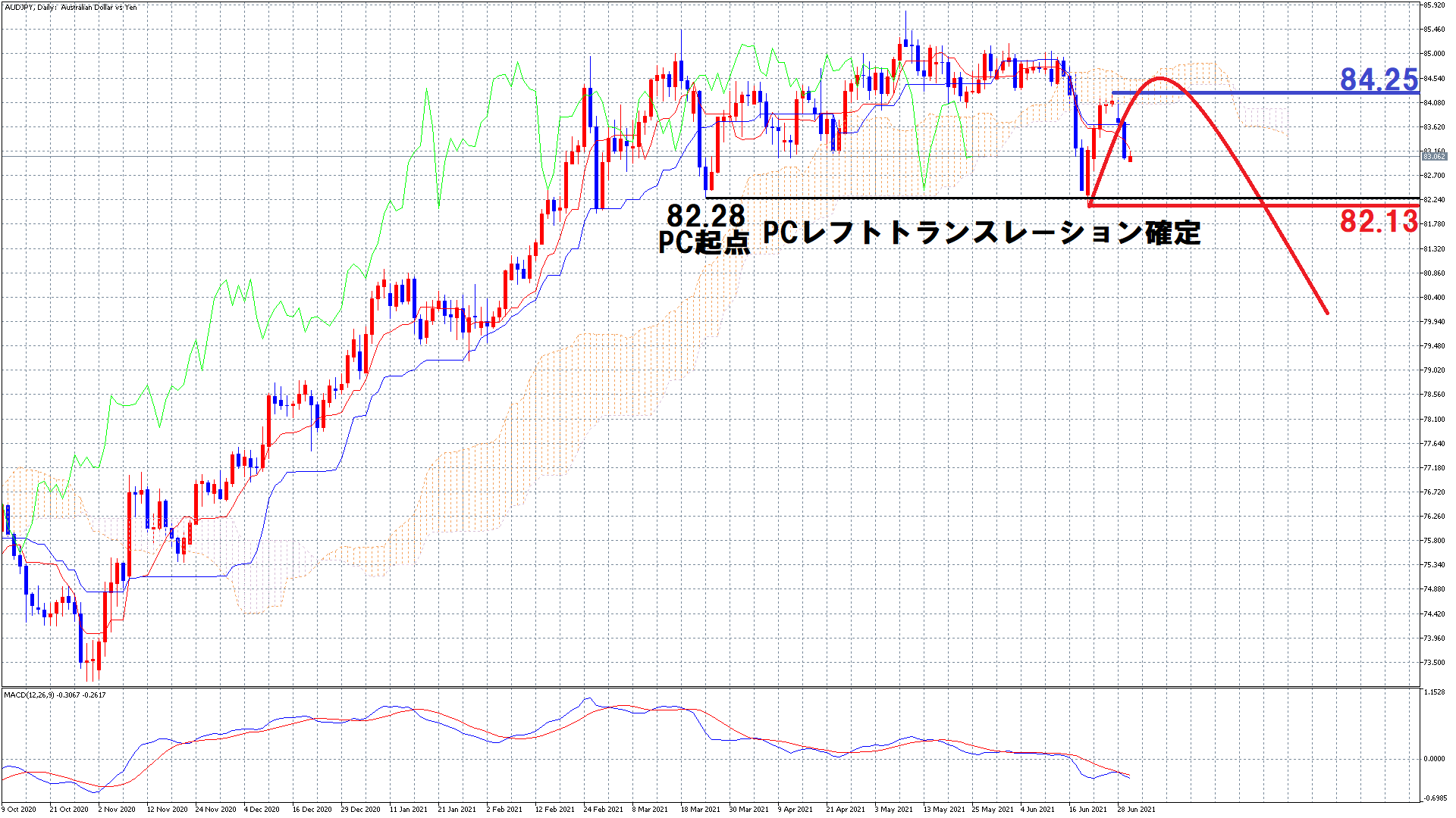 なぜかというと、豪ドル円の前回MCはレフトトランスレーションを形成しています。