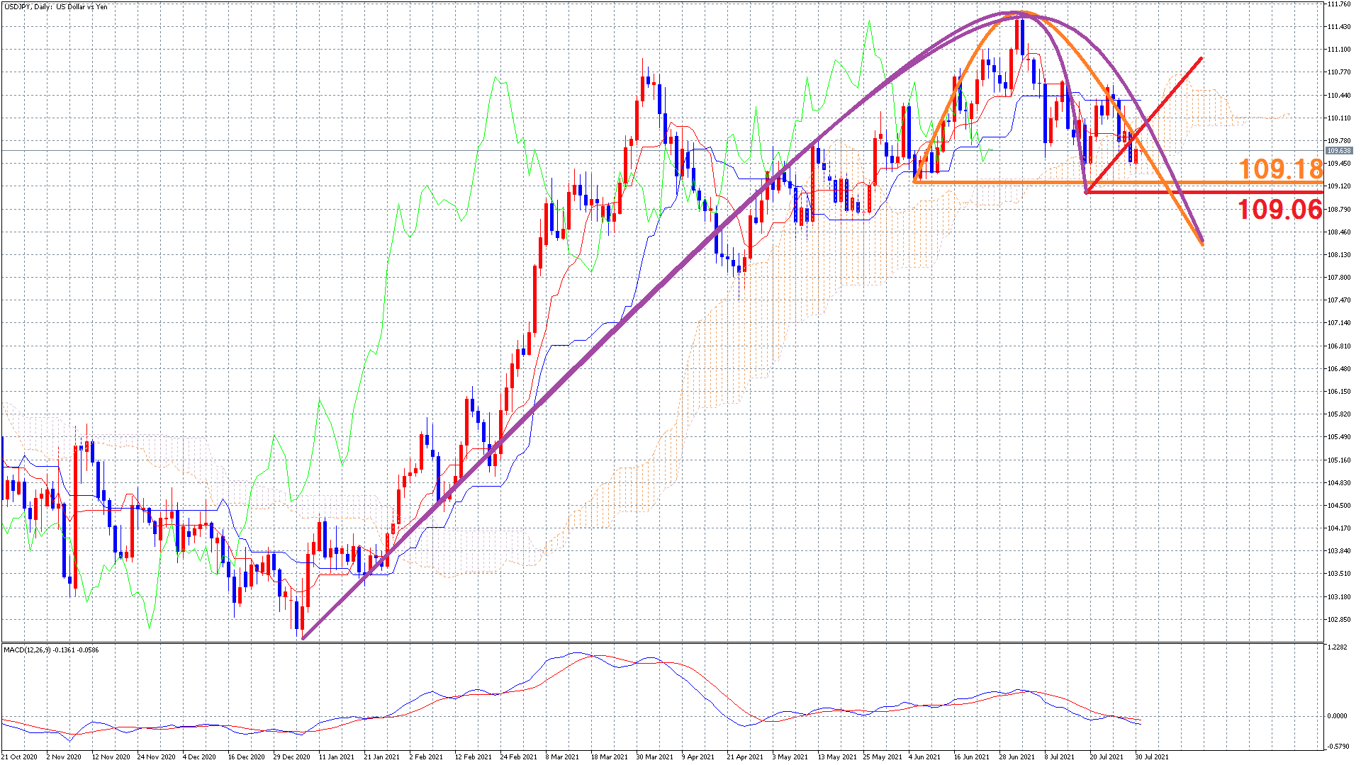 ただ、セオリー通りにいく場合は、直近安値の109.36を割らなければボトムを付けることはできないので、ひとまずここは割って下落していく想定です。