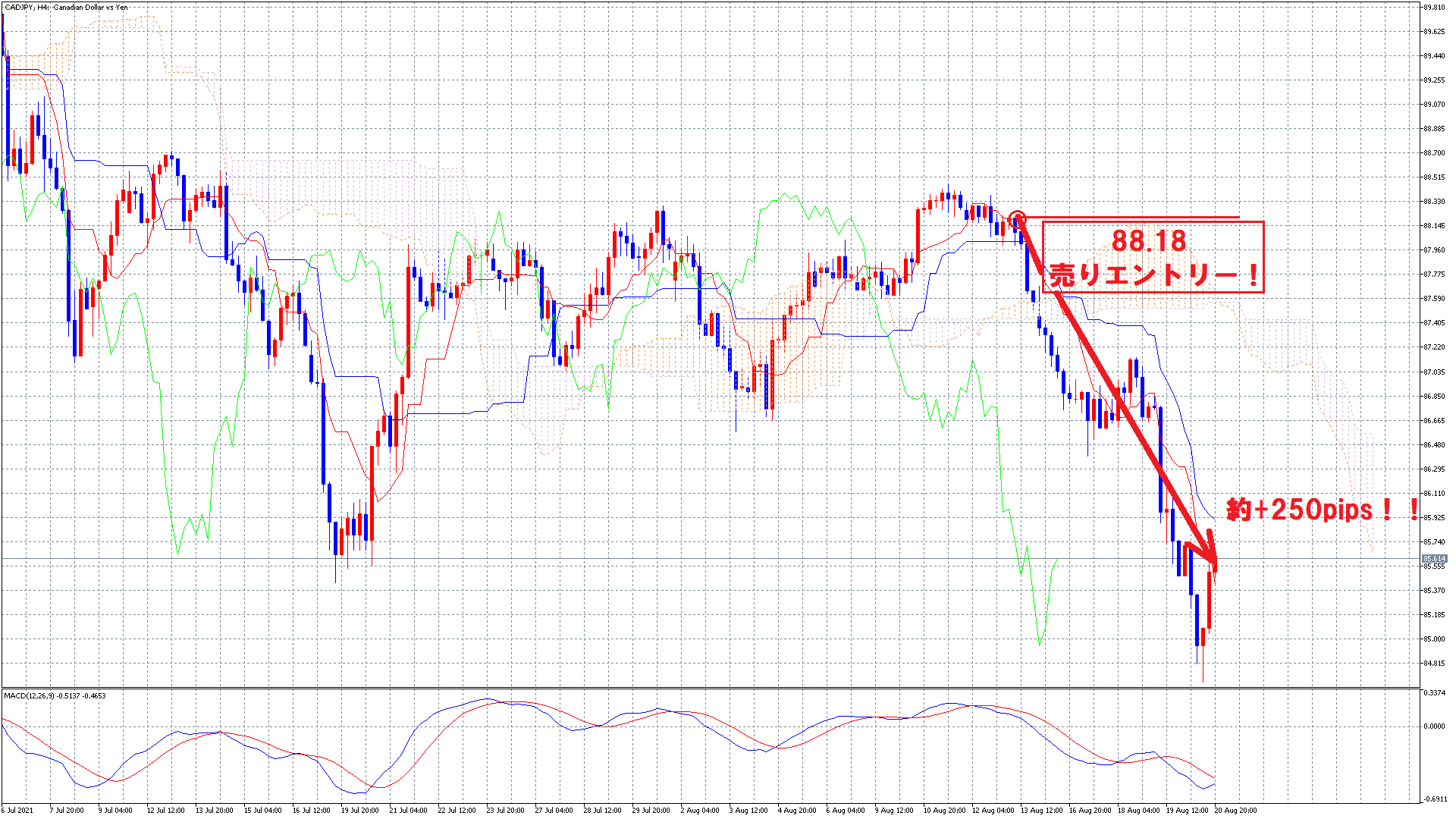 こちらも途中で分割決済などを取り入れて、一部利益確定はしていますが1回のトレードで『+250pips』をとれるトレードをしております♪