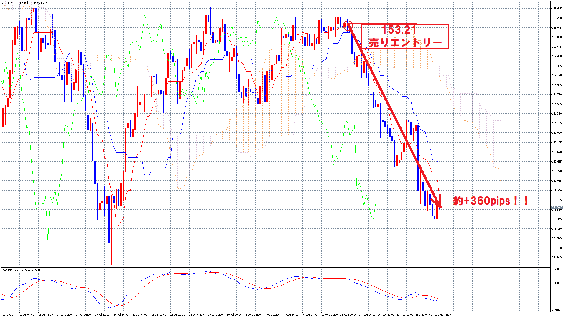 途中で分割決済などを取り入れて、一部利益確定はしていますが1回のトレードで『+360pips』をとれるトレードをしております♪