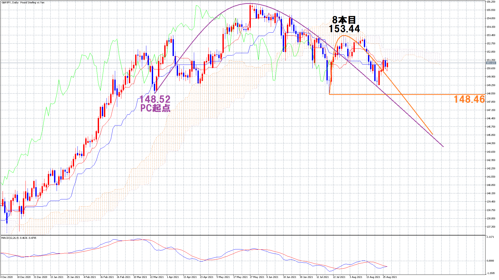 オレンジのラインが起点で高値を8本目につけています。