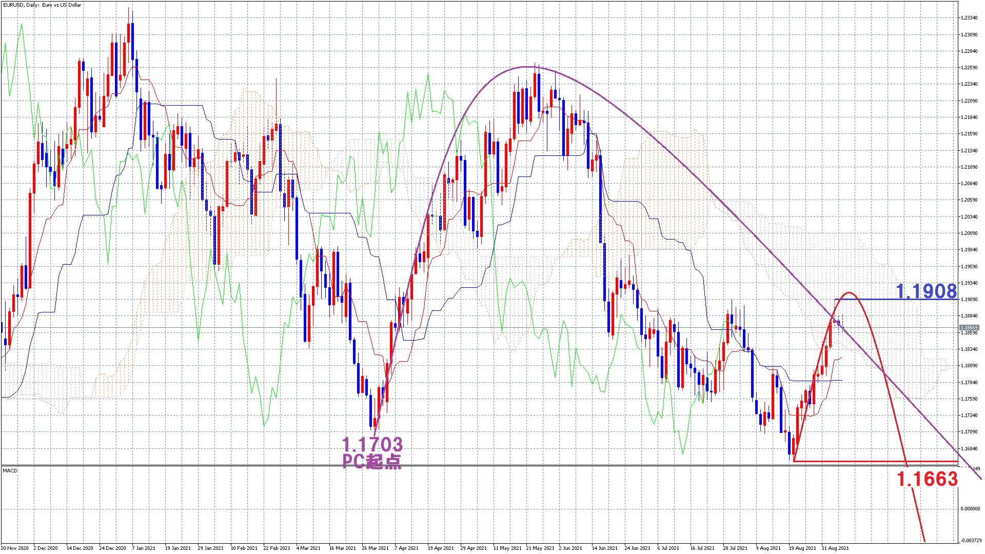 PCで21本目の安値というのはボトムの時間帯に入っていない中での安値になるので、セオリー通りあれば赤のラインを割って下落していく可能性が高いです。