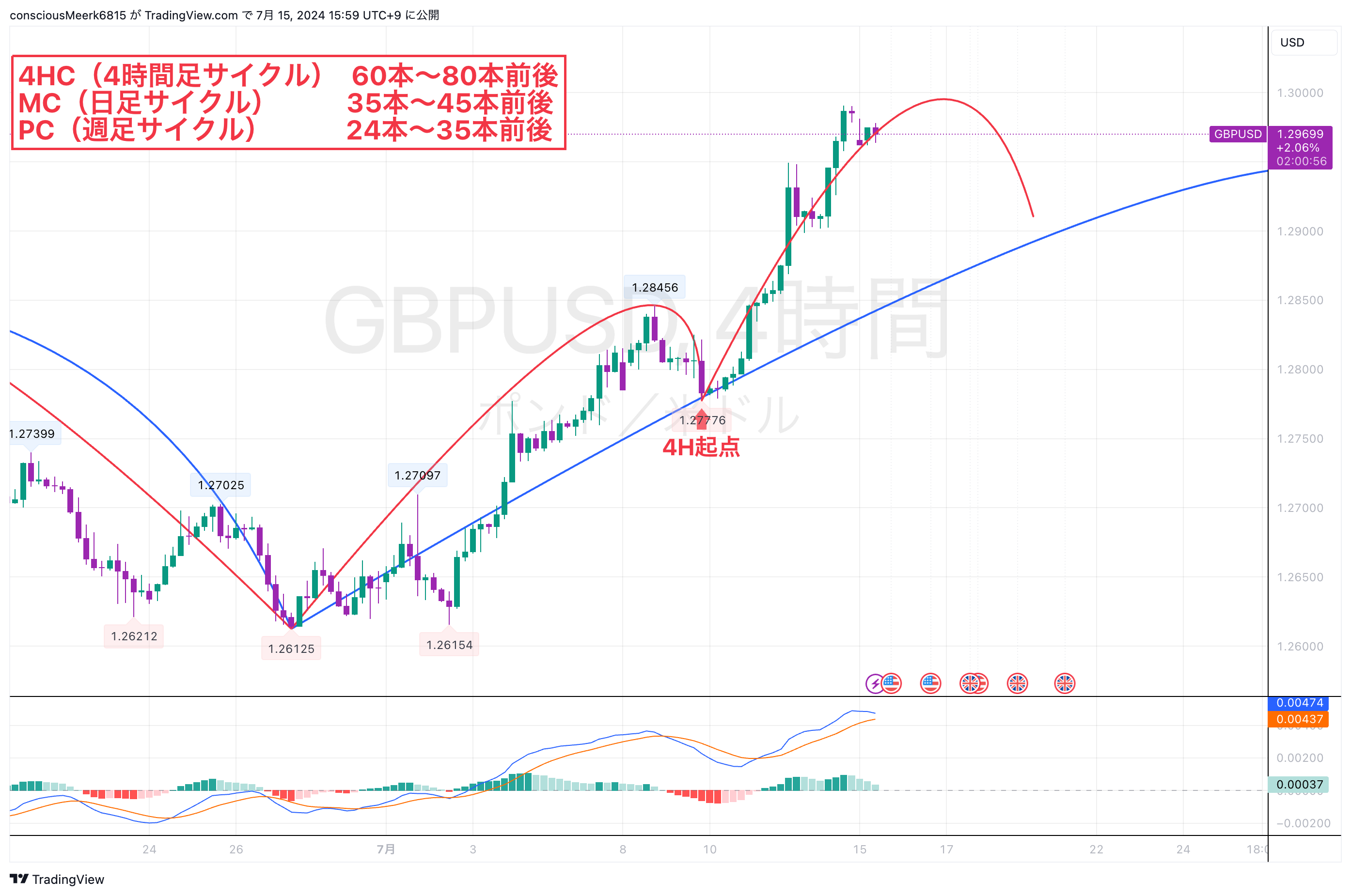 ただ、現在は4HCボトムの時間帯に突入しているので、ショートエントリーポイントではありません。