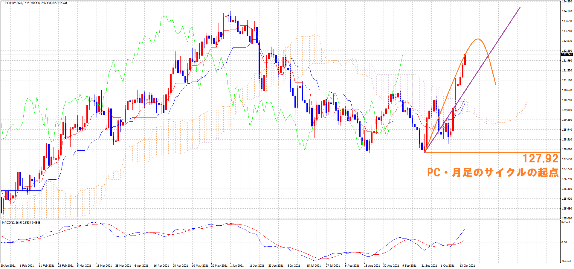 ユーロ円の4HCも無事ライトトランスレーションを形成する可能性が高くなったので、クロス円は下落反転には警戒しておきましょう。