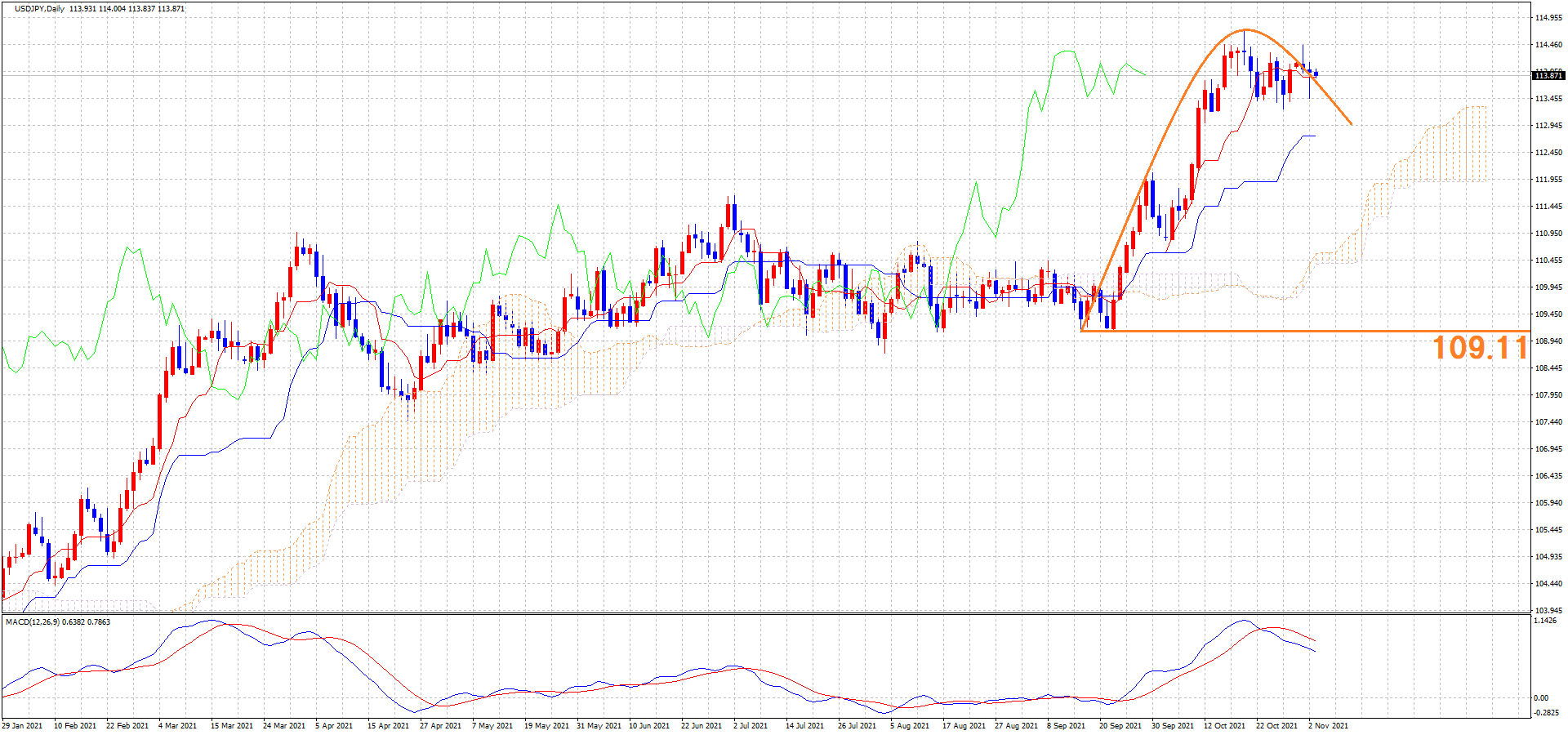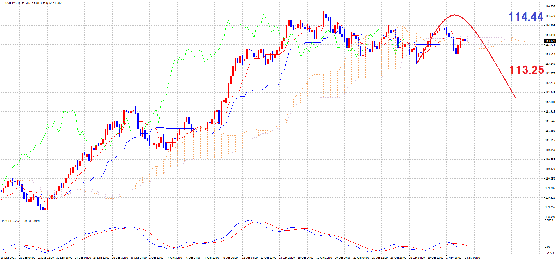 そしてドル円もクロス円同様、4HCレフトトランスレーションの想定で見ているので、MCも続落の想定です。