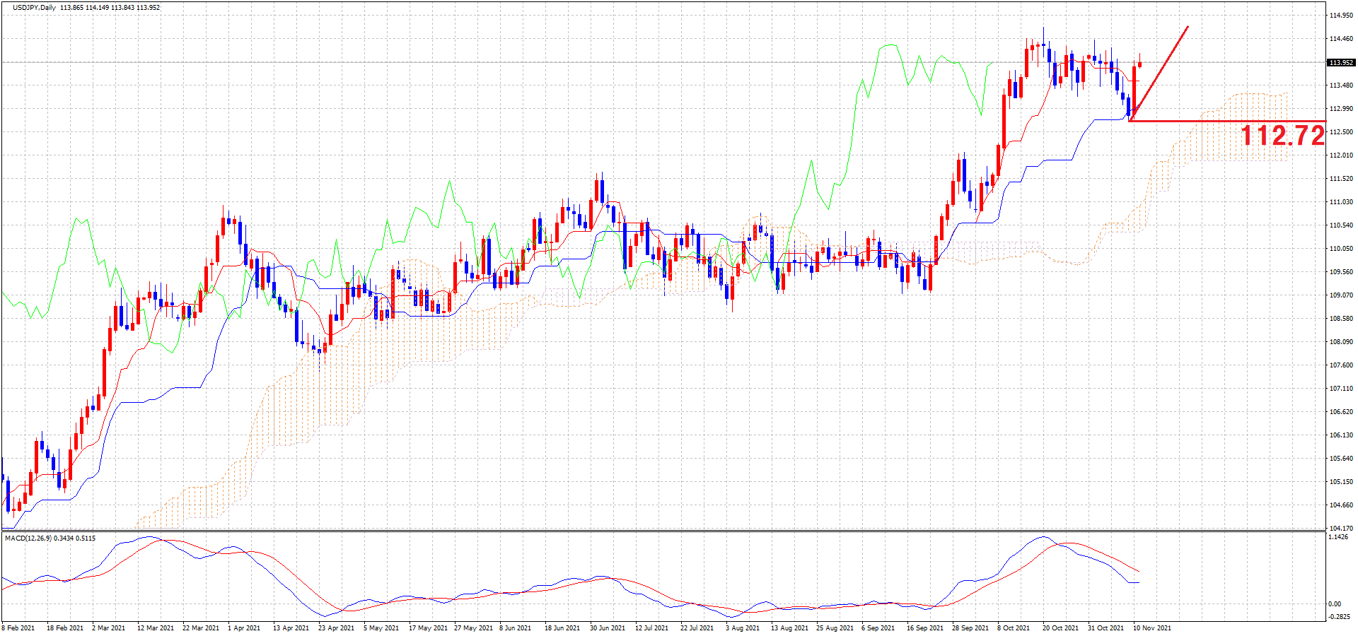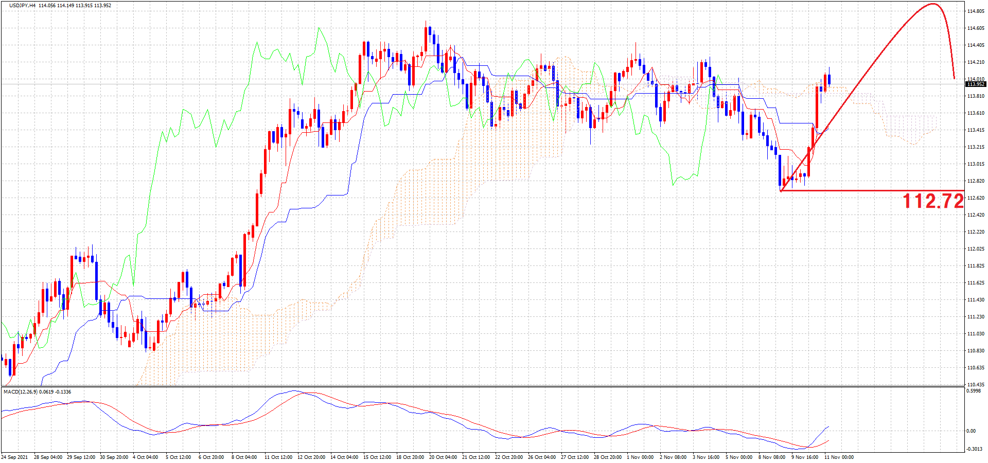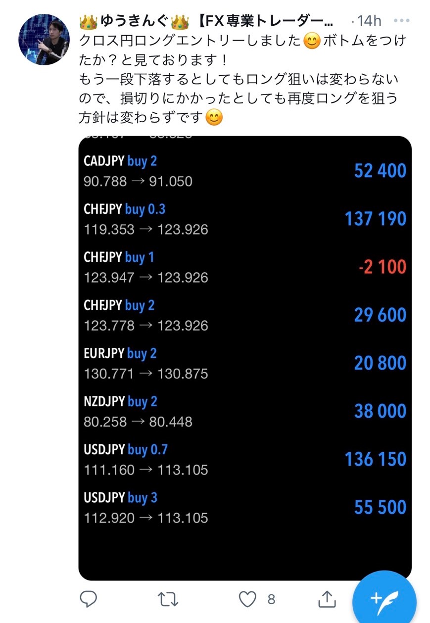 私は、4HC短縮の可能性を想定していて、4時間足のMACDがゴールデンクロスしそうな状況、他銘柄のクロス円では日足で下ヒゲを確認して、上昇の流れになっている事などから、ロングエントリーをしていました!