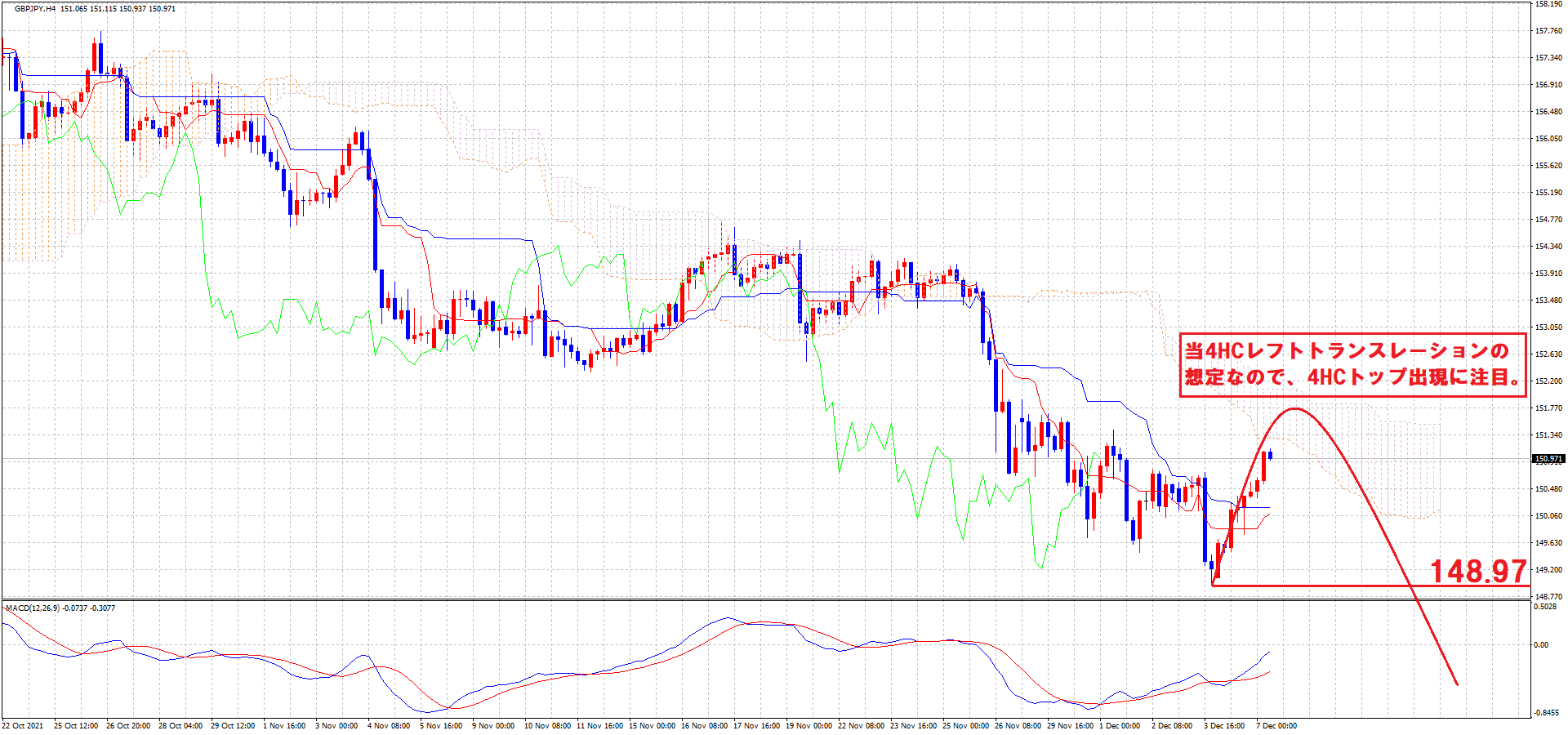 この場合まだ上昇反転したばかりなので、まだまだ上昇の余裕があるというような形で考えられますが、現在中長期の下落トレンドに位置している可能性が高い状況で、今回の4HCはレフトトランスレーションを形成する可能性が高いとみております。