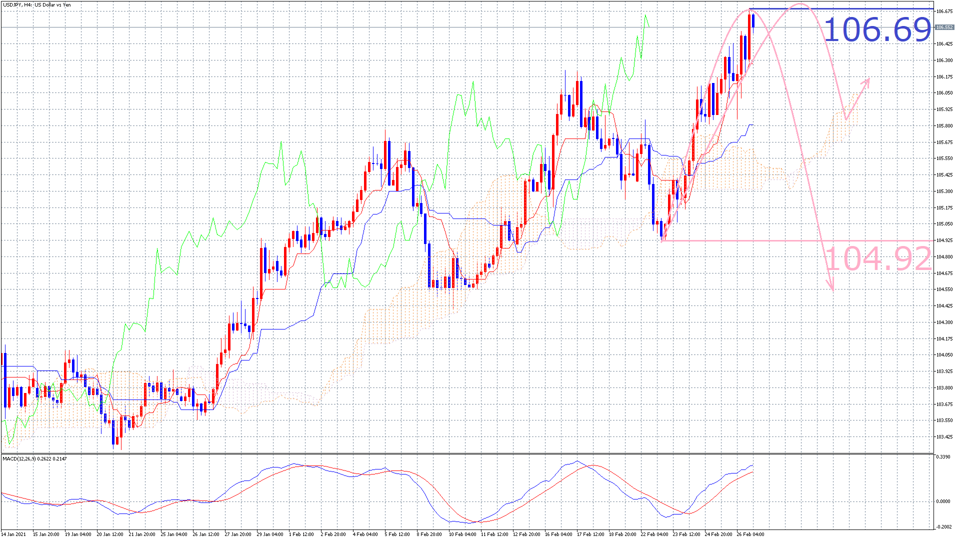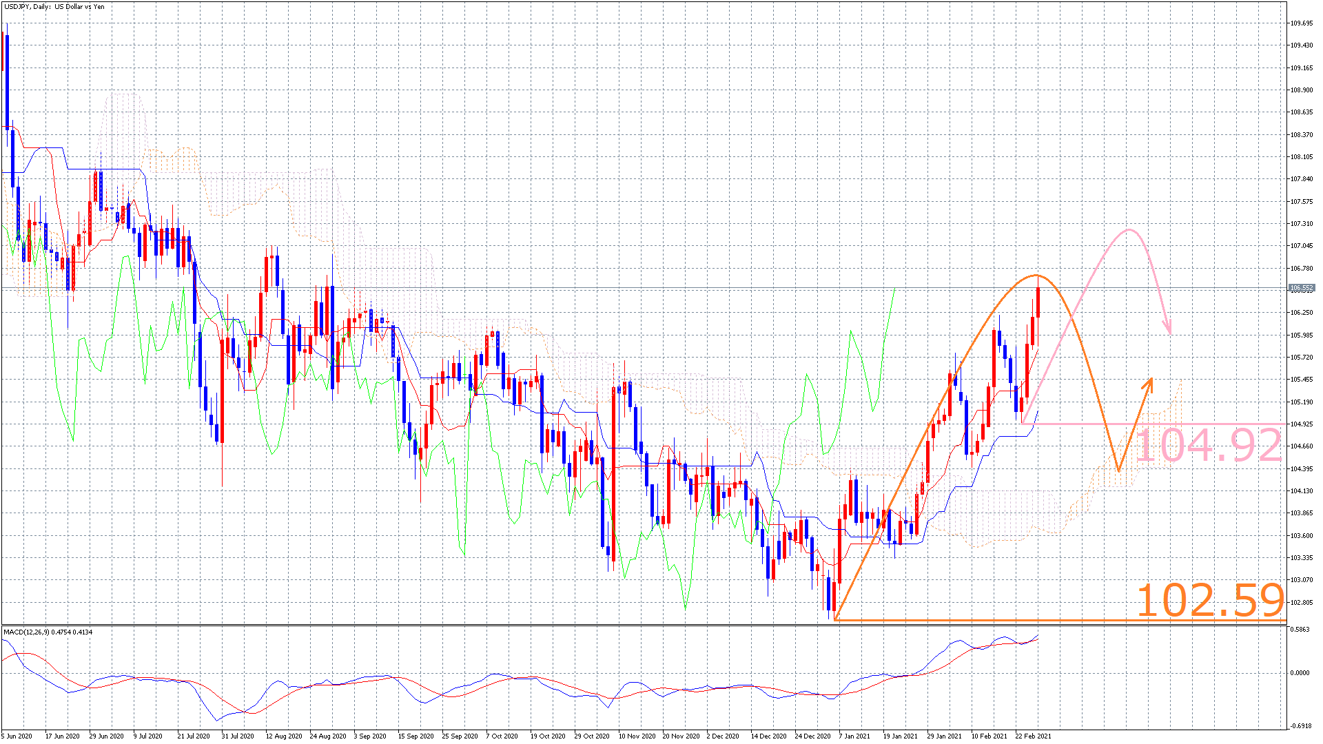 ピンクのラインの場合は、既に日足が反転しているシナリオになるので、まだまだ上昇していくことが可能です(^^)/