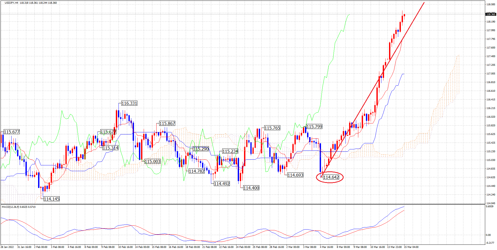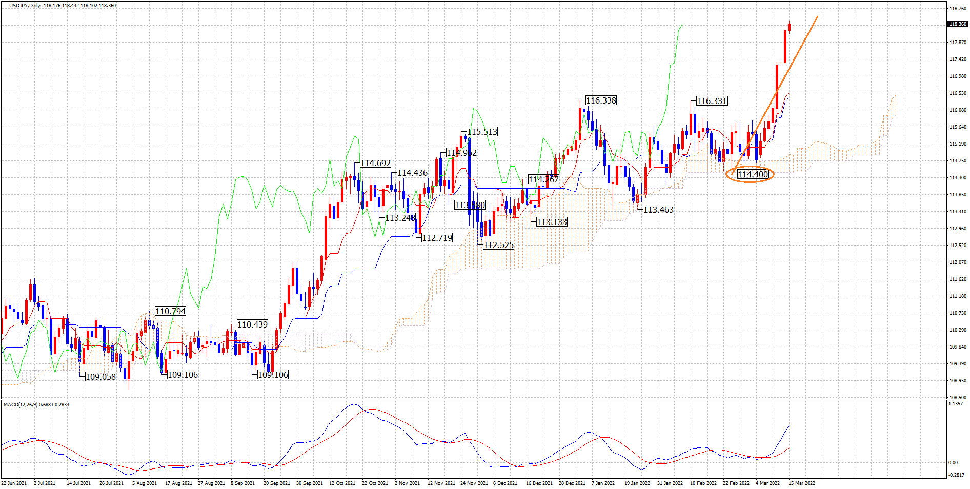 オレンジのポイントが起点の場合、MCは15本目でまだまだ時間的な余裕はありますので、さらに高値更新をする可能性も視野に入れながら見ていきますね👍