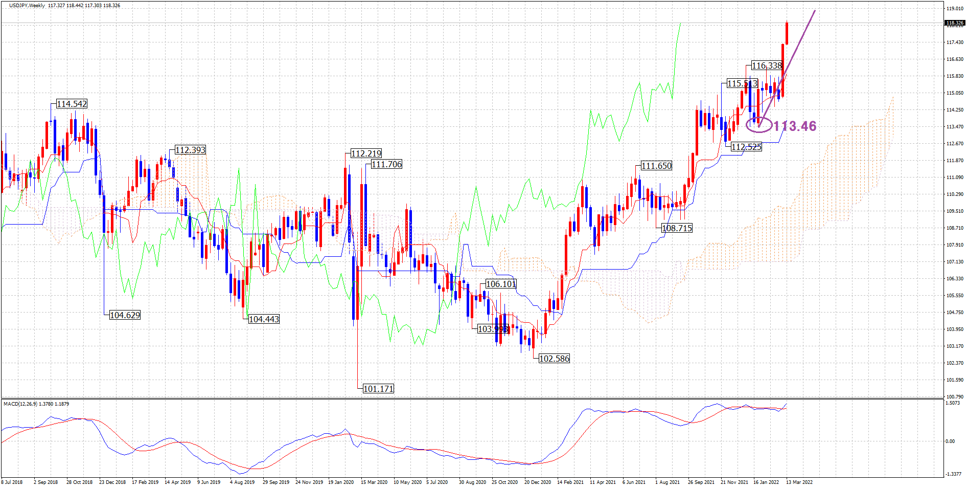 そして、ドル円は高値更新が続いているので、先日Youtubeでお伝えしているように中期も上昇トレンドのシナリオで見ていきたいと思います。