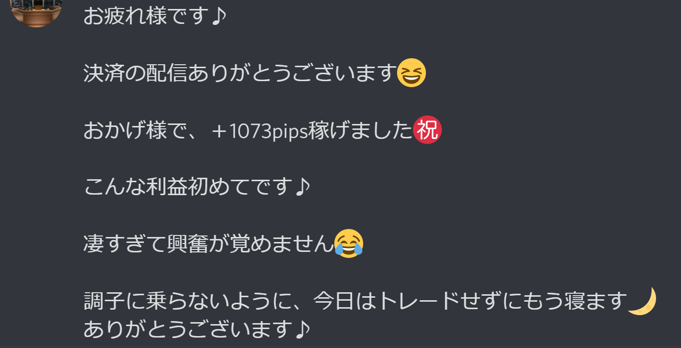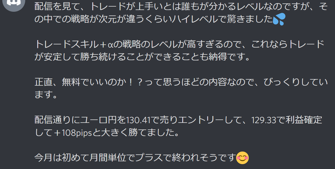 最近では「+1000pipsオーバーの利益も取れました!」という声も数多くメッセージ頂いてます♪