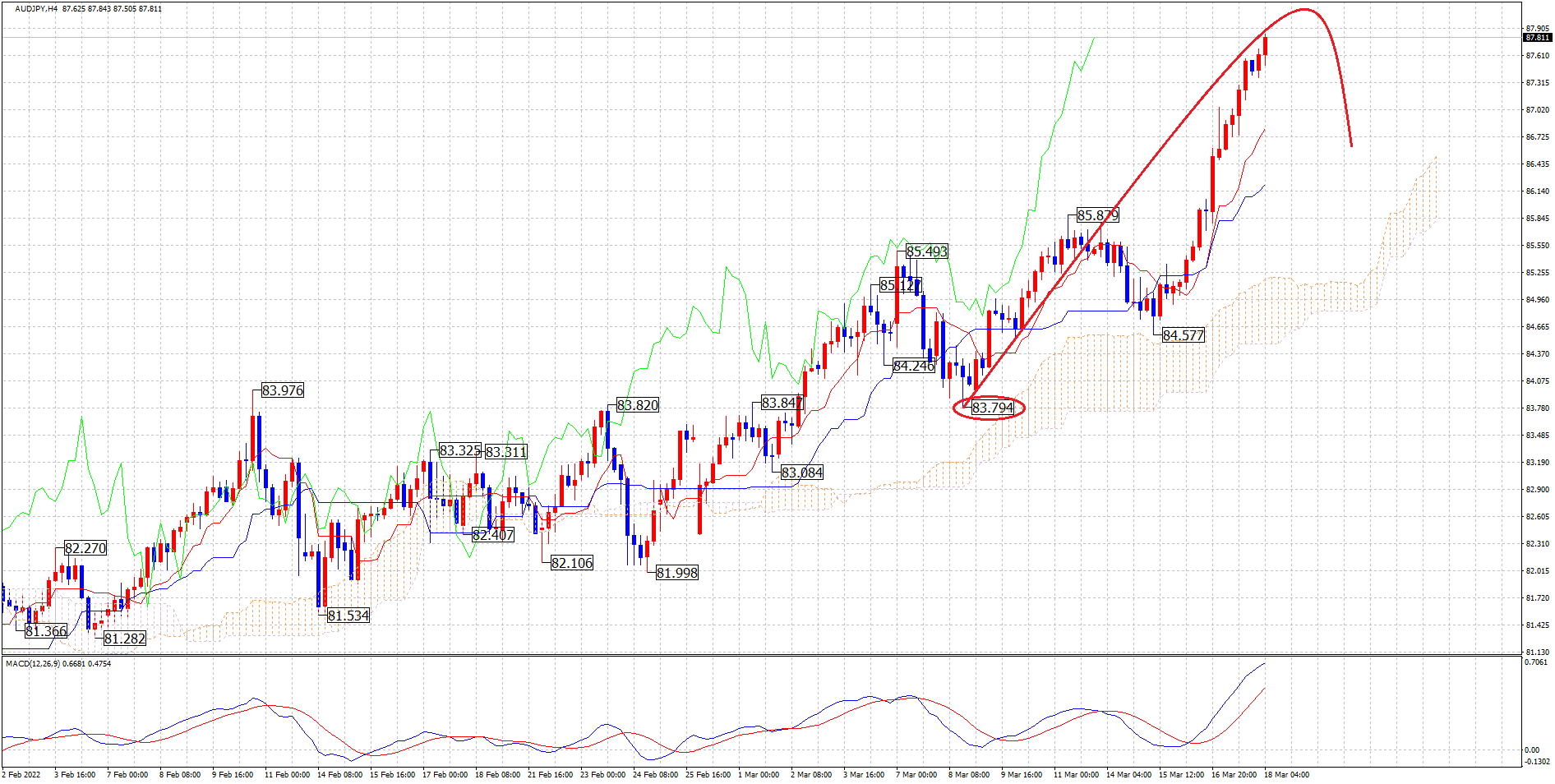 84.57が起点の可能性も有りますが、ユーロ円とポンド円の4HCが3/8前後が起点のシナリオで確定しましたので、豪ドル円も3/8の安値の赤のポイントが起点の可能性が高いとみております。