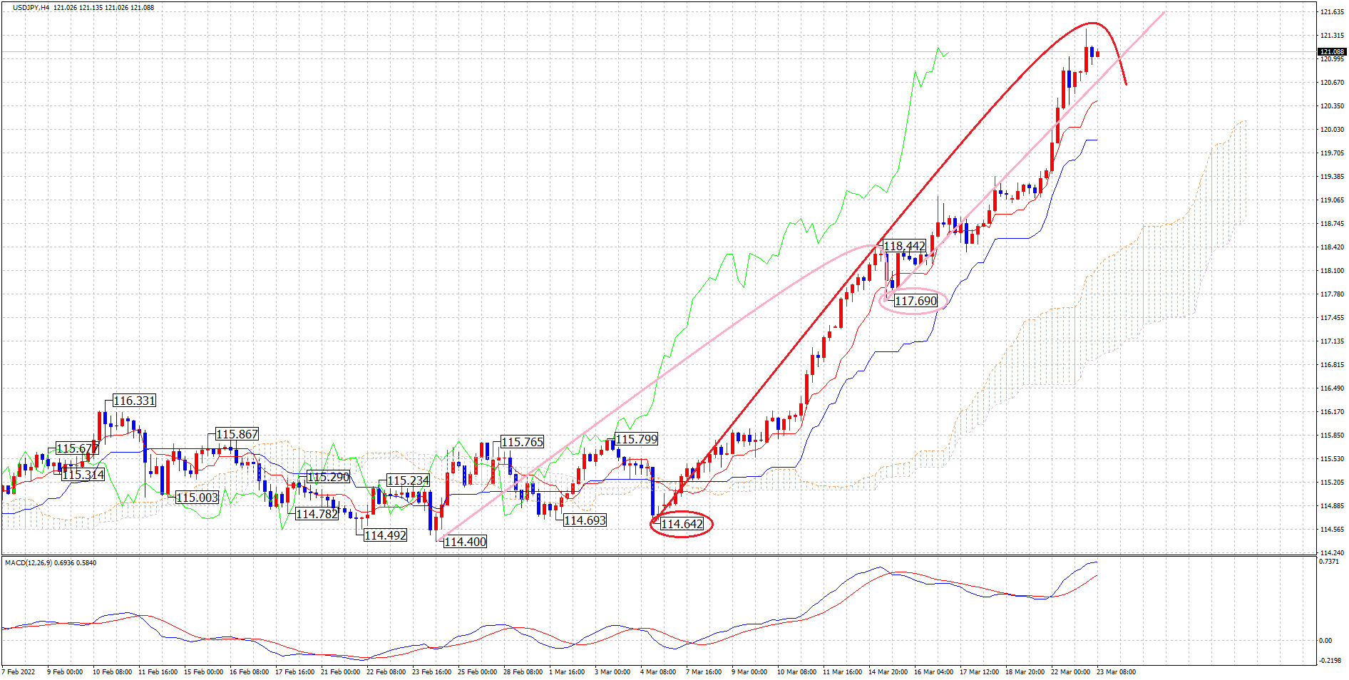 上記の状況なので、PC・MCレベルではアップトレンドが継続されていると見ることができるので、トレード自体はロングエントリー狙いです。