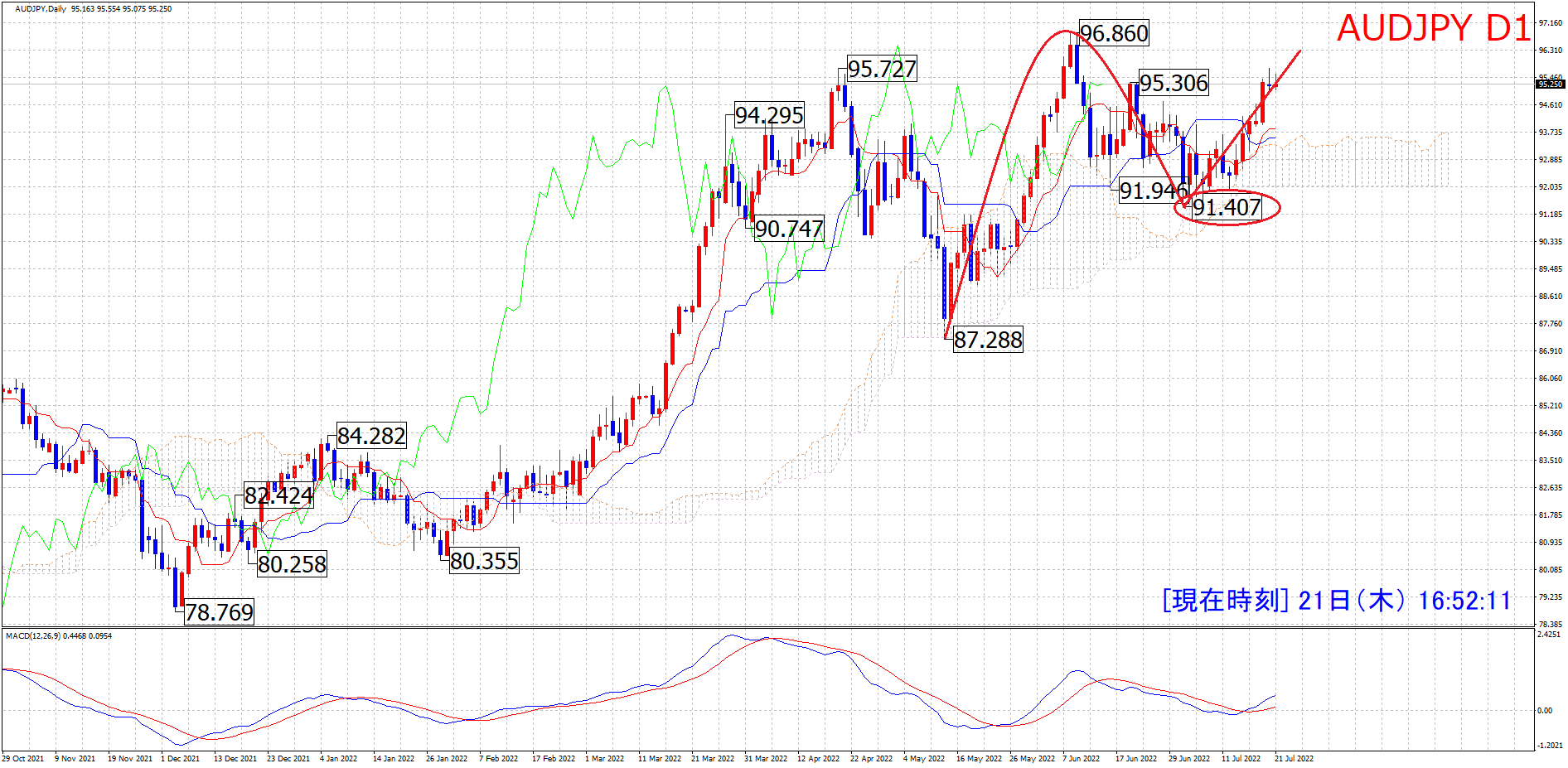 以前からお伝えしていた、ポンド円のMCの状況から豪ドル円は91.94がMCの起点で既にレフトトランスレーションを確定しているというシナリオの可能性もありましたが、そのシナリオは一度起点割れを見た後に高値更新をする展開となりましたので消滅です。