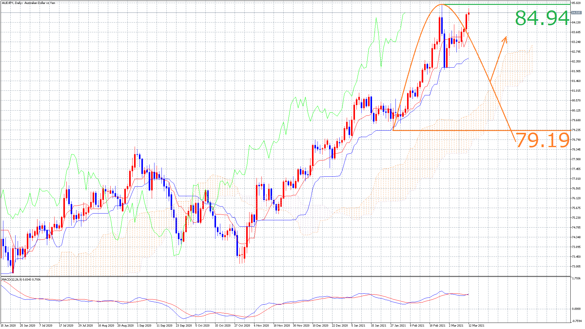 上記までのことから今は、4時間足の天井を迎えていく可能性が想定はされますが、日足目線で見ると高値を更新する可能性も想定できます。