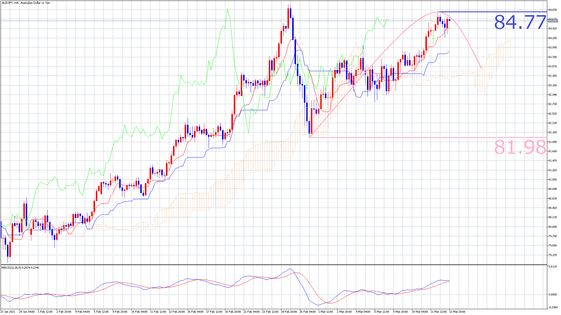 ブログは豪ドル円につい見ていきたいと思うので、早速4時間足のチャートから見ていきましょう(^^)/