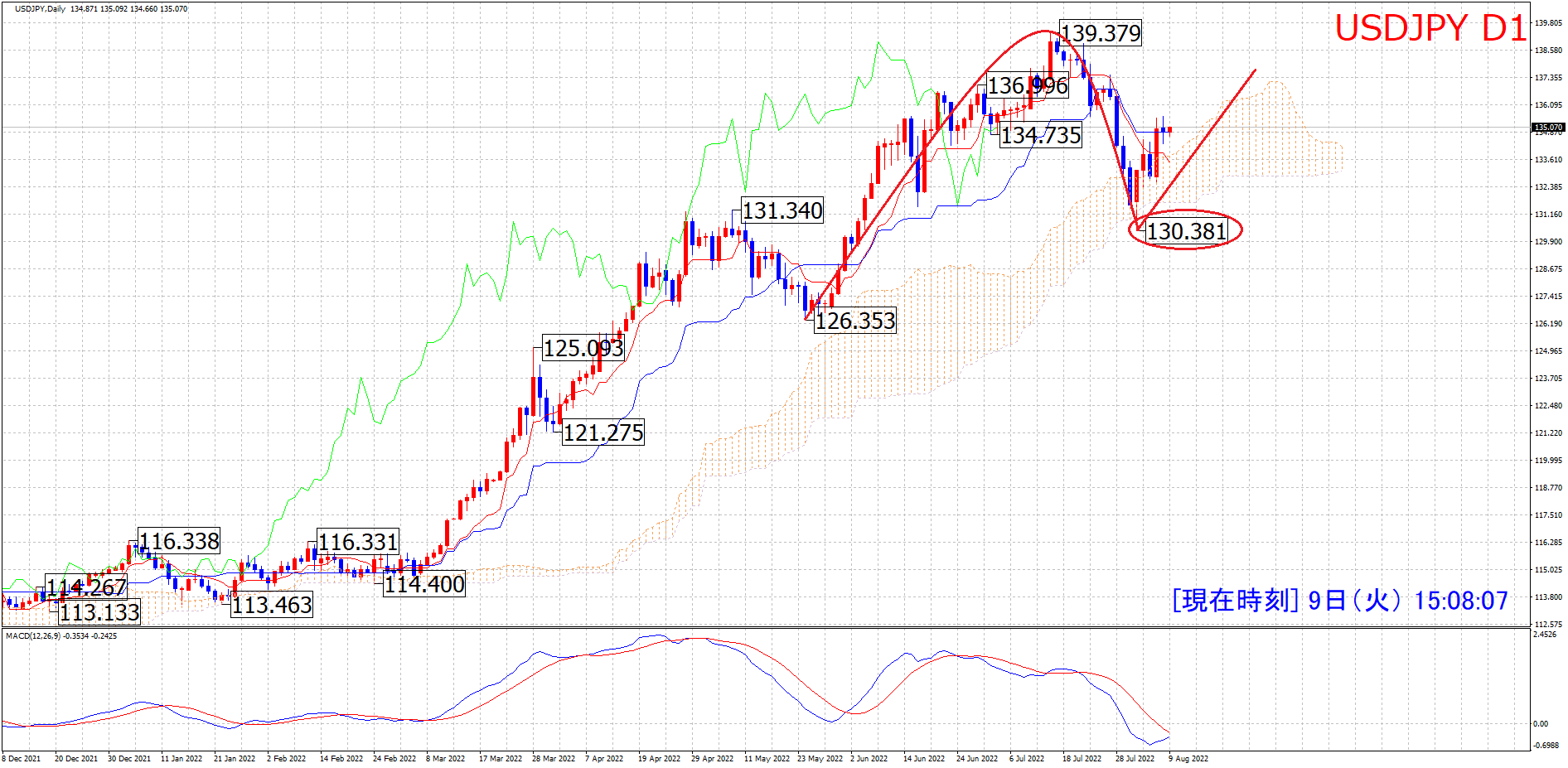 これから135.56が起点のサイクルで進行するためには、赤のポイントを割る下落をする必要があります。