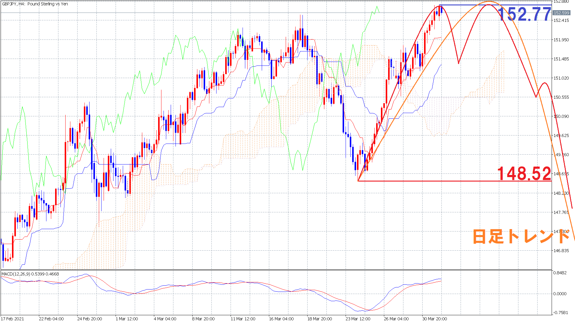 ここで反転している場合は、まだアップトレンドに入ったばかりなので、ここから続伸していく可能性が想定されますが、日足はダウントレンドの形を形成していく可能性が高いとみています。