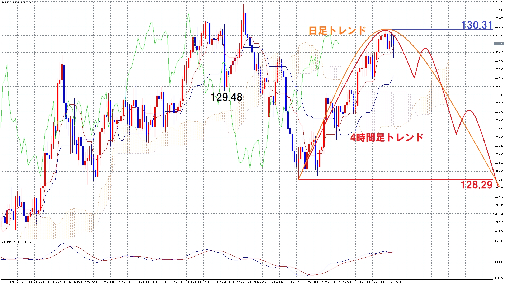 前回想定の、129.49のシナリオはボトム時間までの時間的余裕がない状態で大きく上げているので、可能性としてはひくと思ったので、今は赤のラインで見ています(^^)/