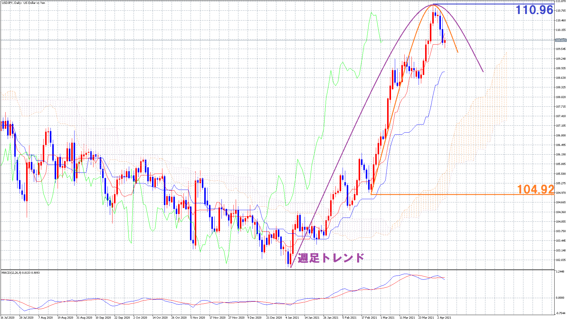 週足レベルで各銘柄ばらばらの動きをしていくということは考えづらいので、ドル円に関しても週足天井を付けていく可能性が想定されます(^^)/