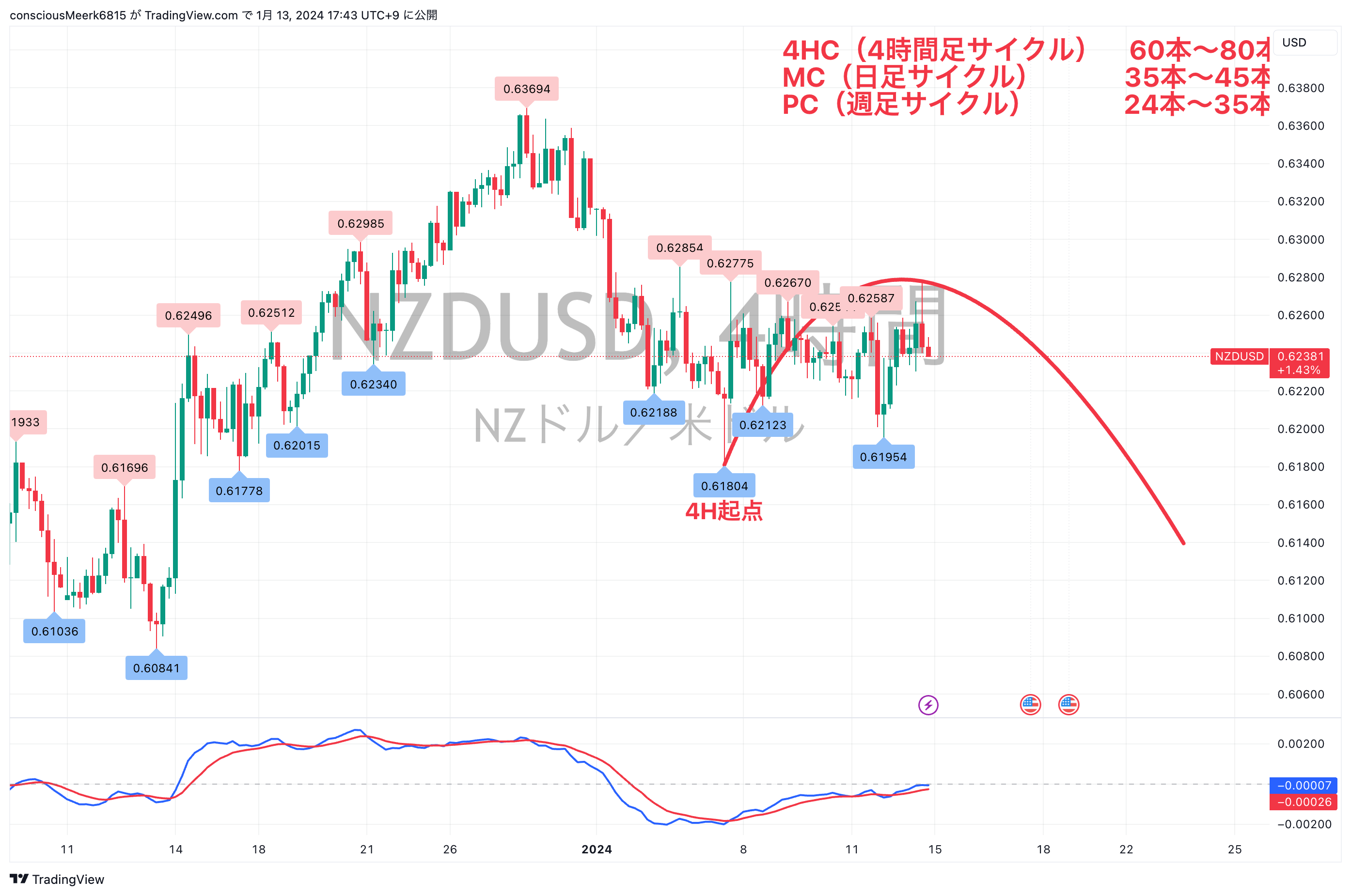 ただ、他通貨ペアの前回の4HCがレフトトランスレーションを形成しているという考えで現在相場は見ているので今回の4HCはレフトトランスレーションを形成する可能性の方が高いと考えています。