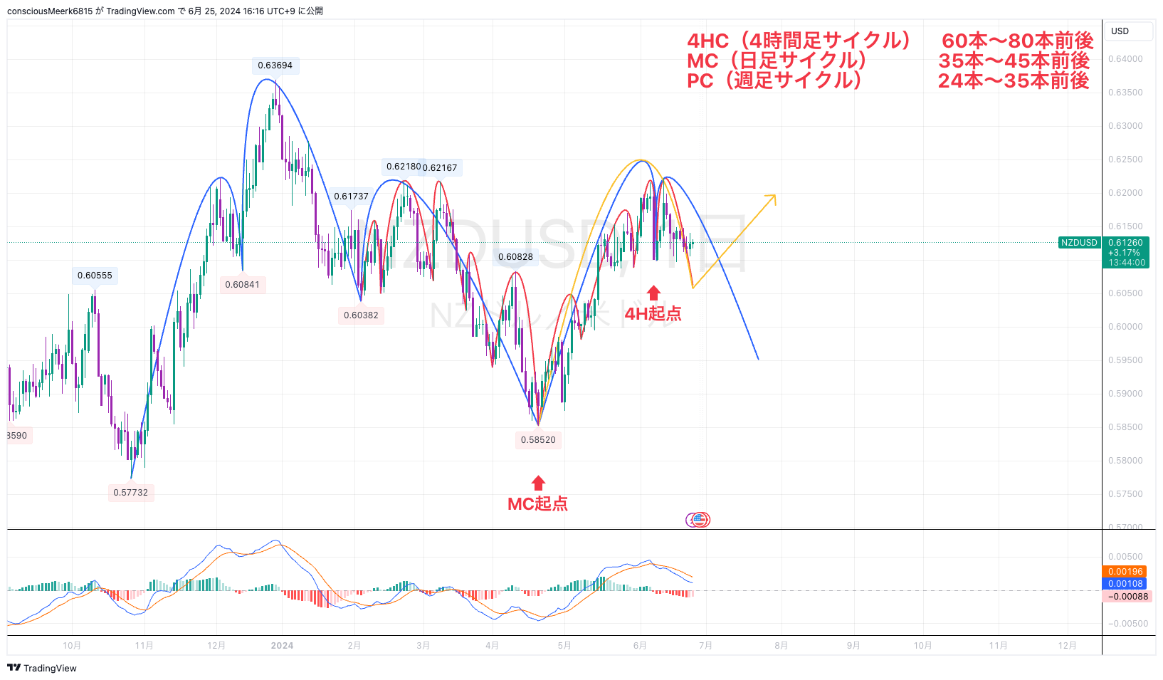後者の場合は今回の4HCボトムがMCボトムなので目先は下落ですがその後上昇のシナリオです。