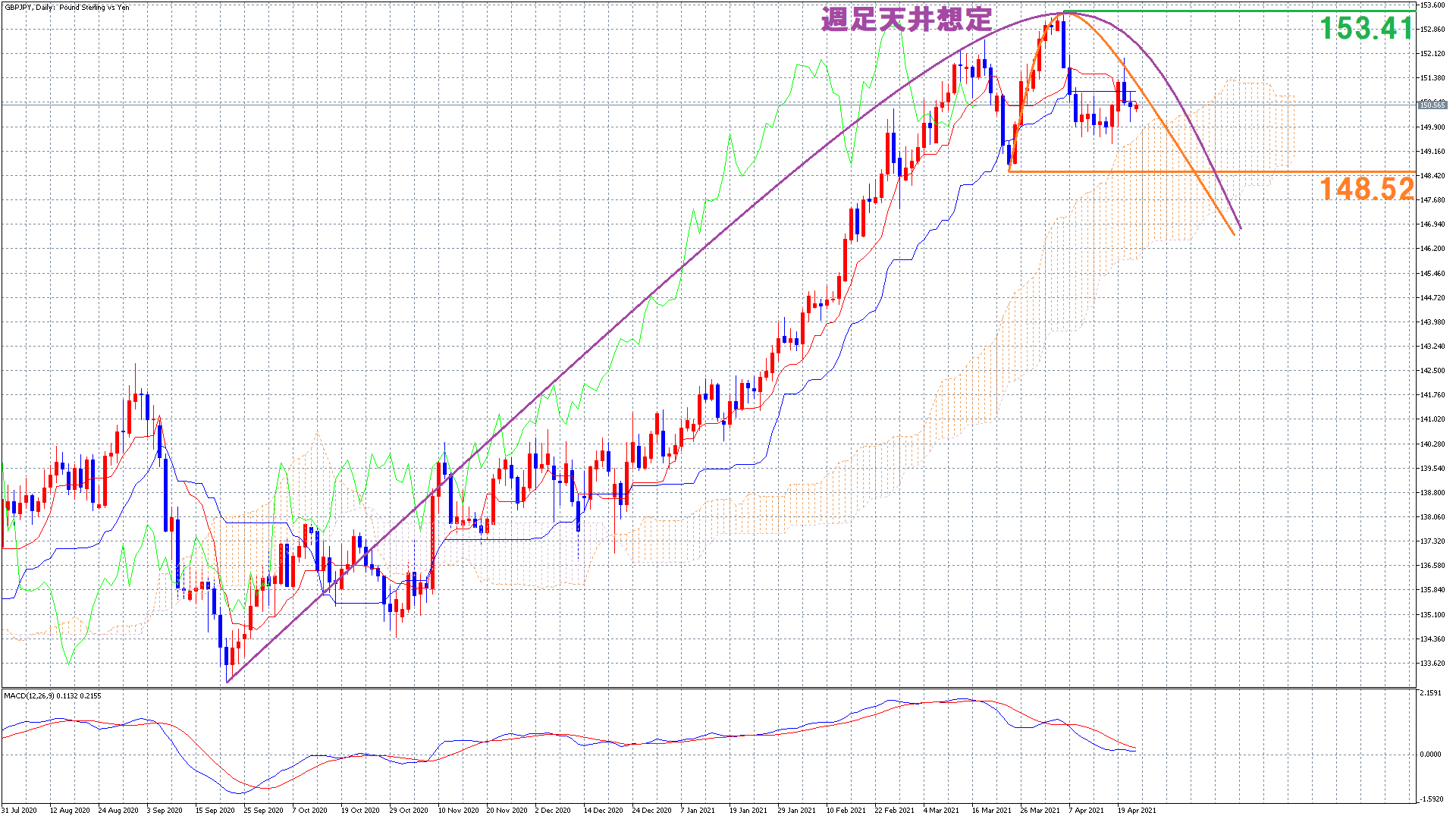 それは、以前からお伝えしているように週足が天井を付けている可能性が高いからです(^^)/