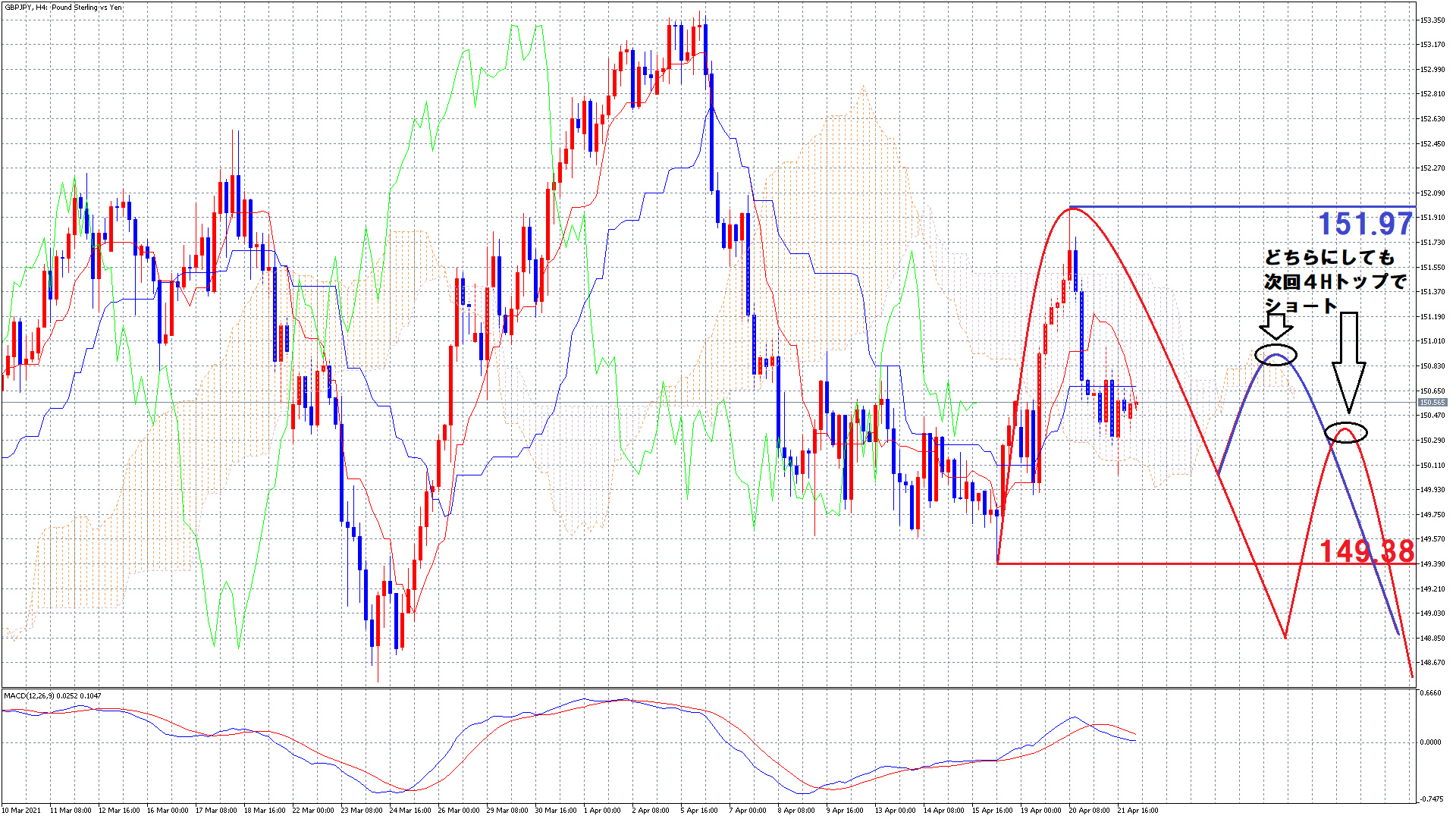 仮に今回が再度青のラインを越える上昇があったとしても、日足週足が天井を付けている想定に変わりはないので、次回4時間足はダウントレンドの形を形成していく可能性が高いです(^^)/