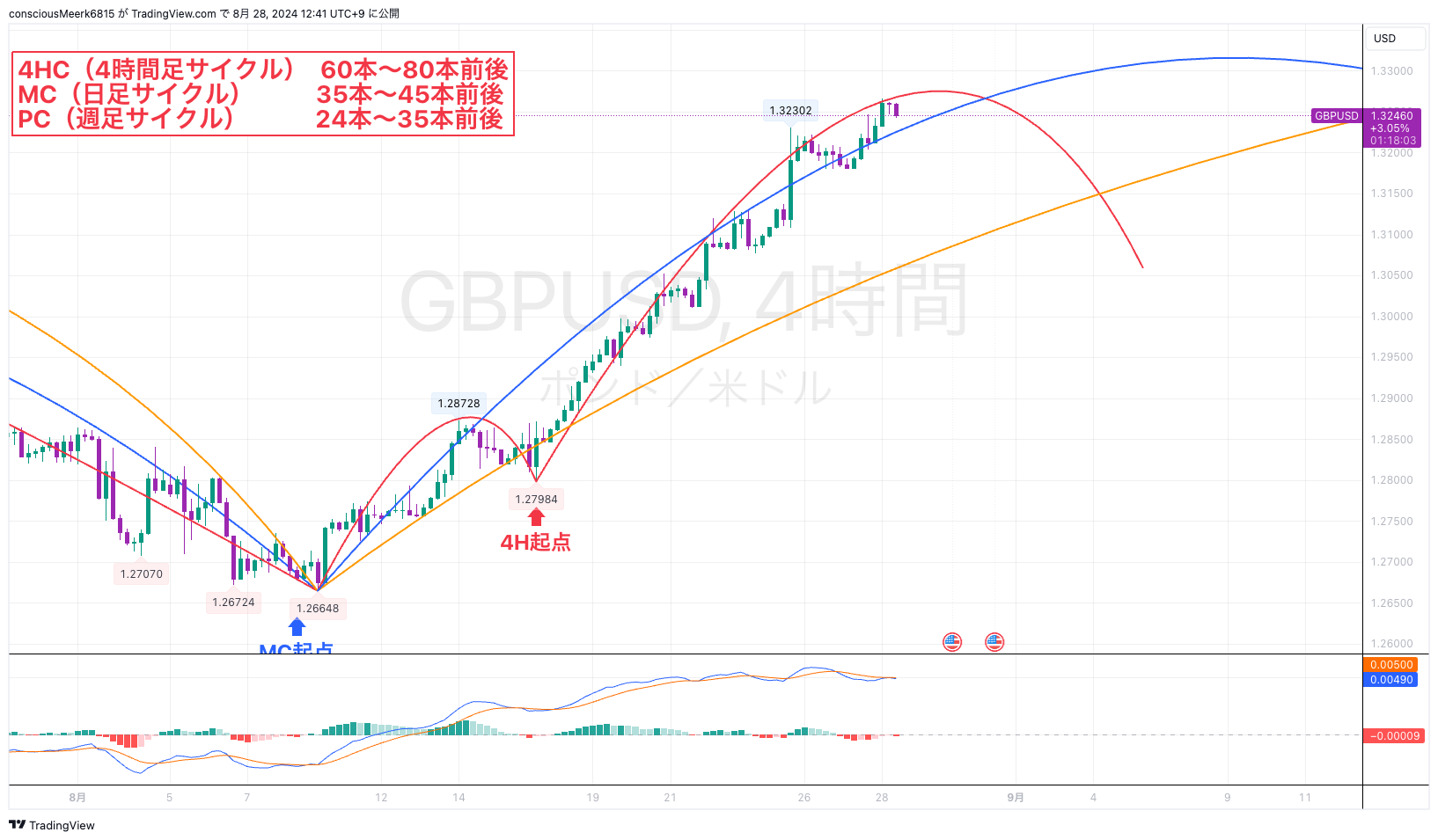 まだ高値更新の可能性もありますが、4HCはすでに61本目なのでボトム時間に入っている状況です。