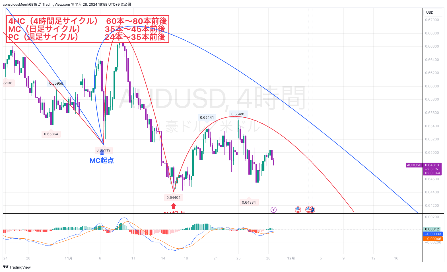 日足の天井が近いということは4HCも天井をつけてもおかしくないという状況です。